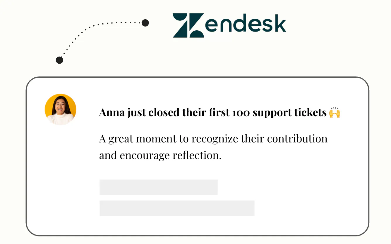 With a system like Pyn, you can connect a system like Zendesk or Salesforce to track milestones and send a nudge to celebrate to their manager if they reach it!