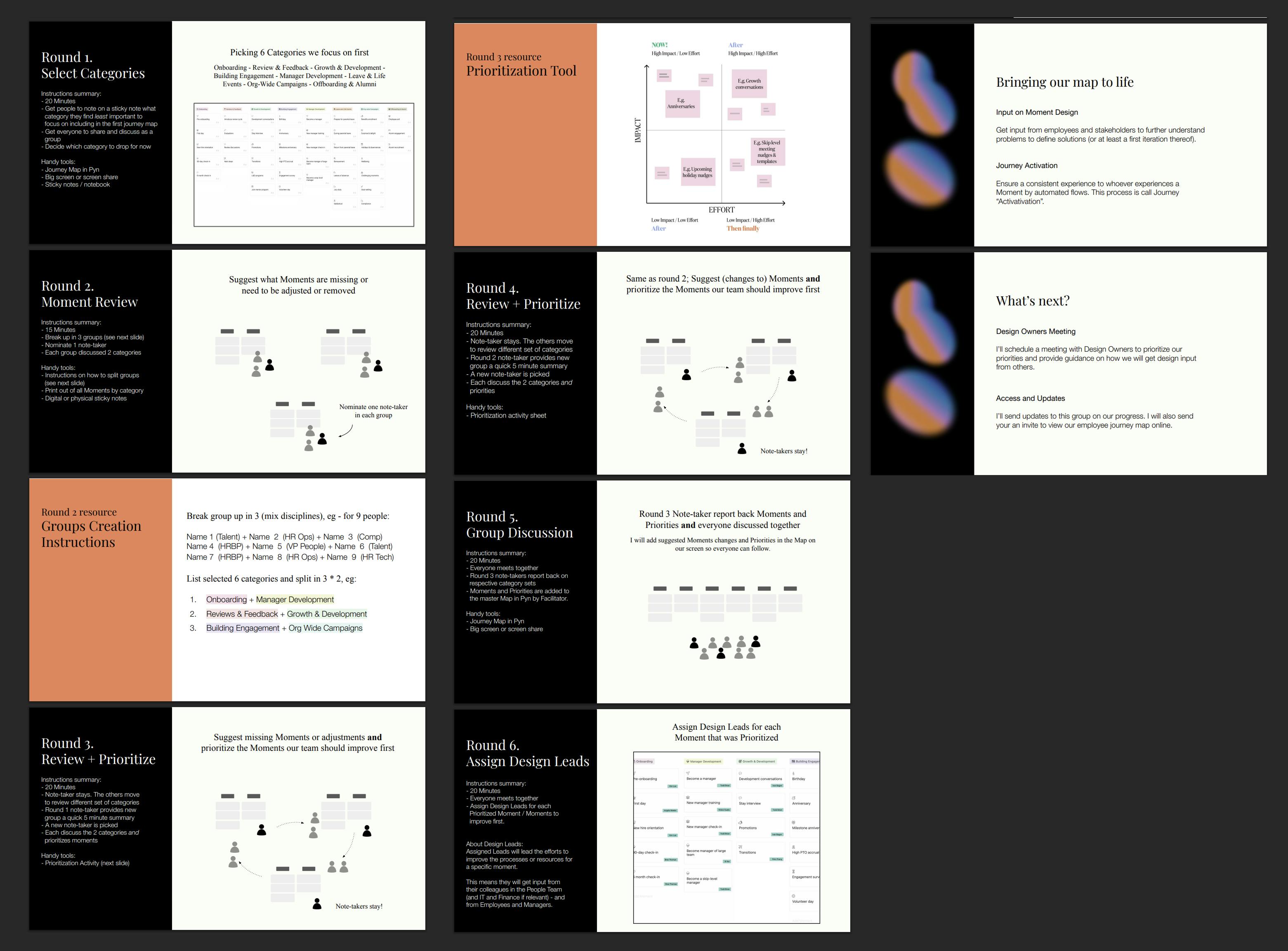 You’ll bring everyone together to review what’s been prioritized, assign Design Leads to each focus moment, and share what’s coming next (e.g., employee input, journey activation flows, ongoing updates).
