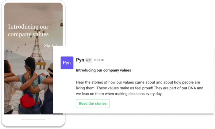 Great company values are often connected to a product mantra. Our Pyn company value of “radical personalization” both reflects how we care about the personal circumstances of our people and our product vision as it relates to employee communications.