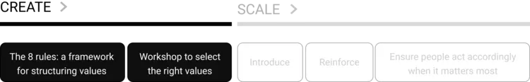 Create: Covers the less familiar topic of a framework for structuring values as well as how to workshop selecting the right values.