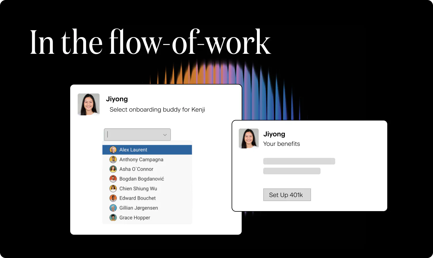 Instead of asking new hires or managers to jump between multiple systems, information and actions should appear directly in familiar tools, like Slack, Teams, or Email.