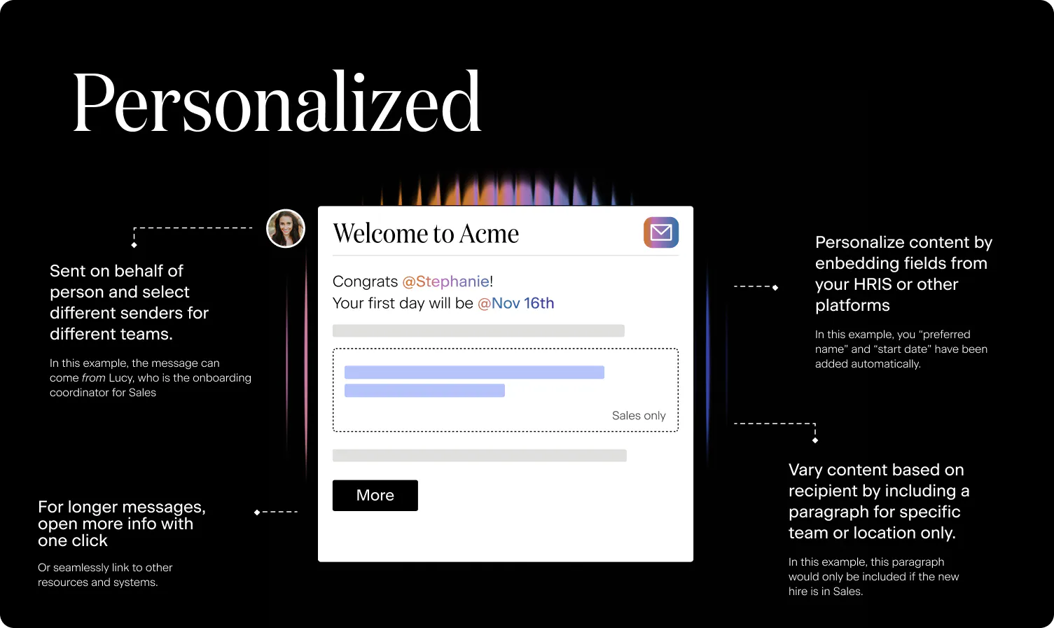 Pull personalized data (e.g., name, manager, start date, location) directly from your HRIS into each message.