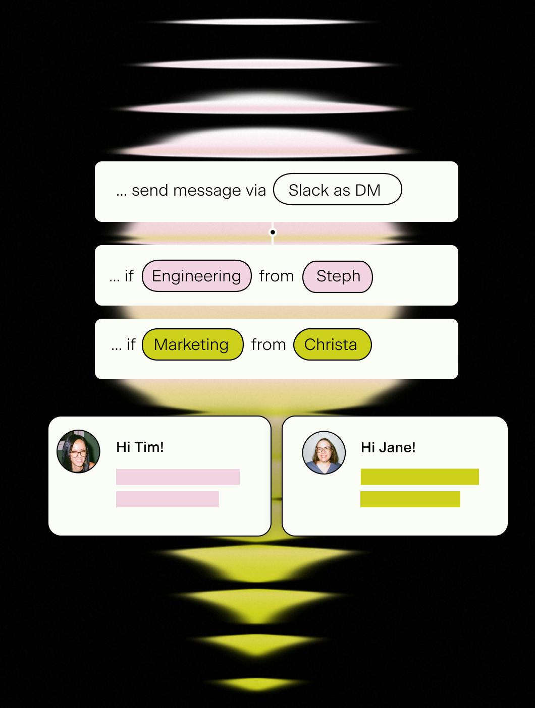 Messages, tasks, polls, forms, calendar invites - all triggered via HRIS and delivered in Slack, Teams, or email.